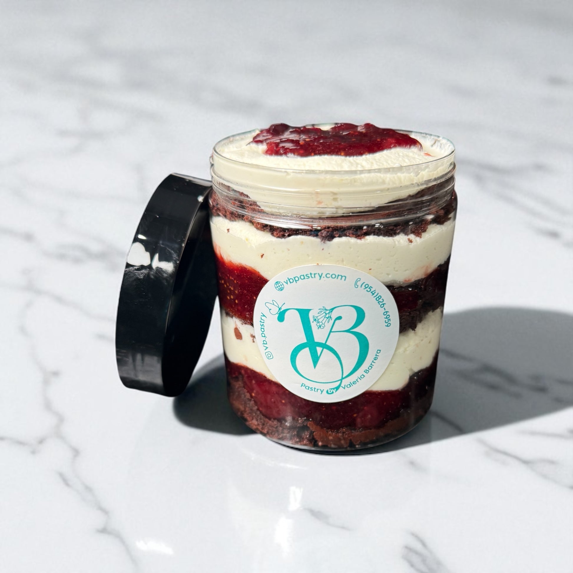 Bizcocho intenso de chocolate 100% cacao, sin harina y sin azĂșcar, relleno con mermelada casera sin azĂșcar de fresas y cherries, y cubierto con chantilly ligero sin azĂșcar. Todo el sabor, cero remordimientos.